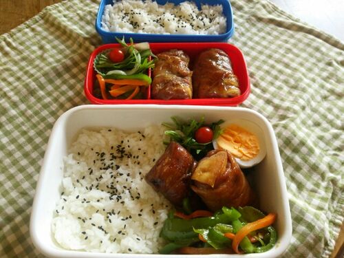 お弁当箱は野田琺瑯の白い保存容器を使っています。今日は高野豆腐の肉巻き弁当はです♪