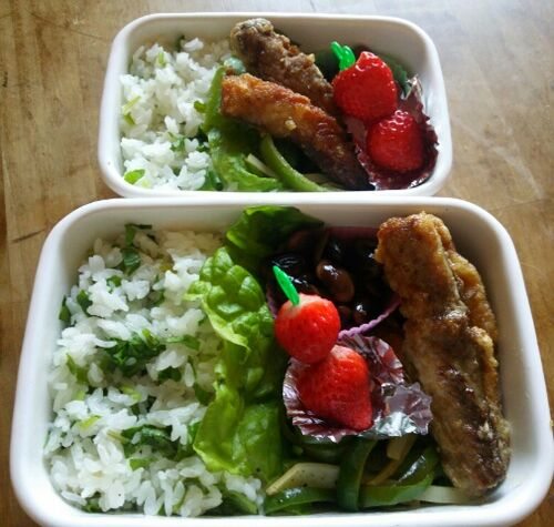 お弁当箱は野田琺瑯の白い保存容器を使っています。今日はサバの竜田揚げ弁当です♪