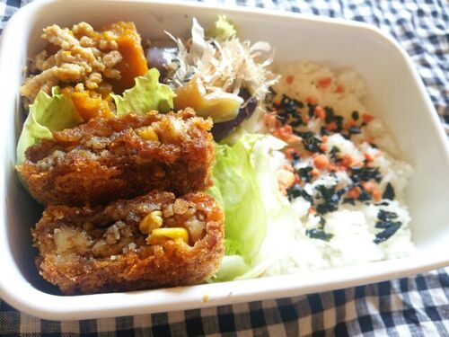 お弁当箱は野田琺瑯の白い保存容器を使っています。今日はコーンコロッケ弁当です♪